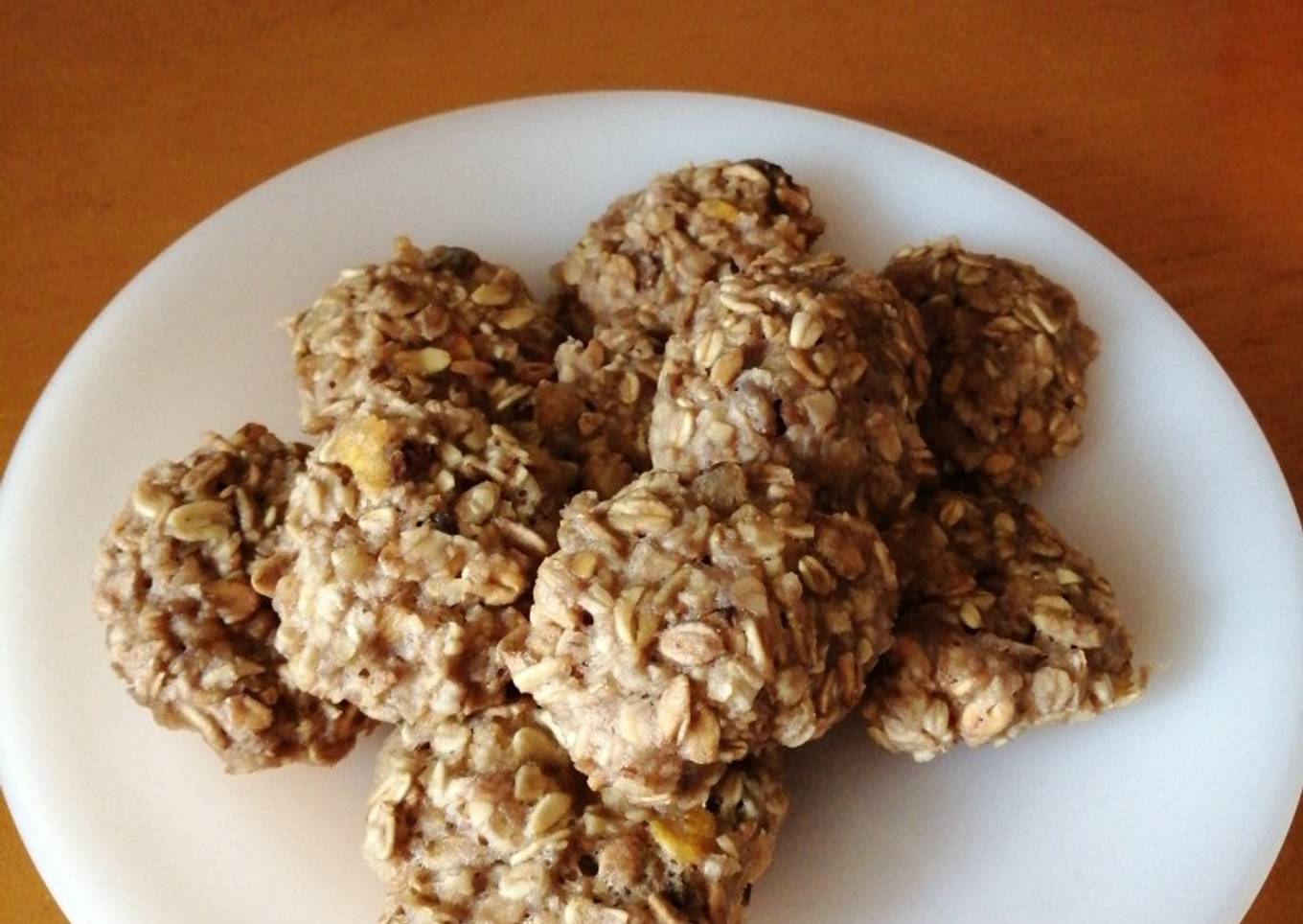 - Chafar bien los plátanos agregar huevo, agregar un puñado de nueces a pedacitos pequeños agregar 4 cucharadas de bebida de arroz y la levadura mezcla bien los ingredientes y agregar un vaso de avena molida y un tazón de muesli integral con pasas remover bien para que se mezcle todo bien