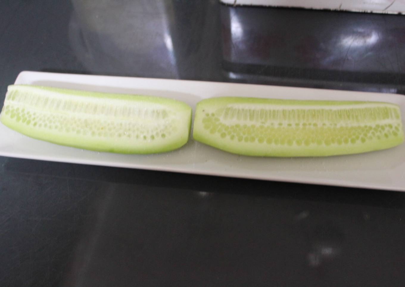 - Cortamos por la mitad, longitudinalmente, el pepino.