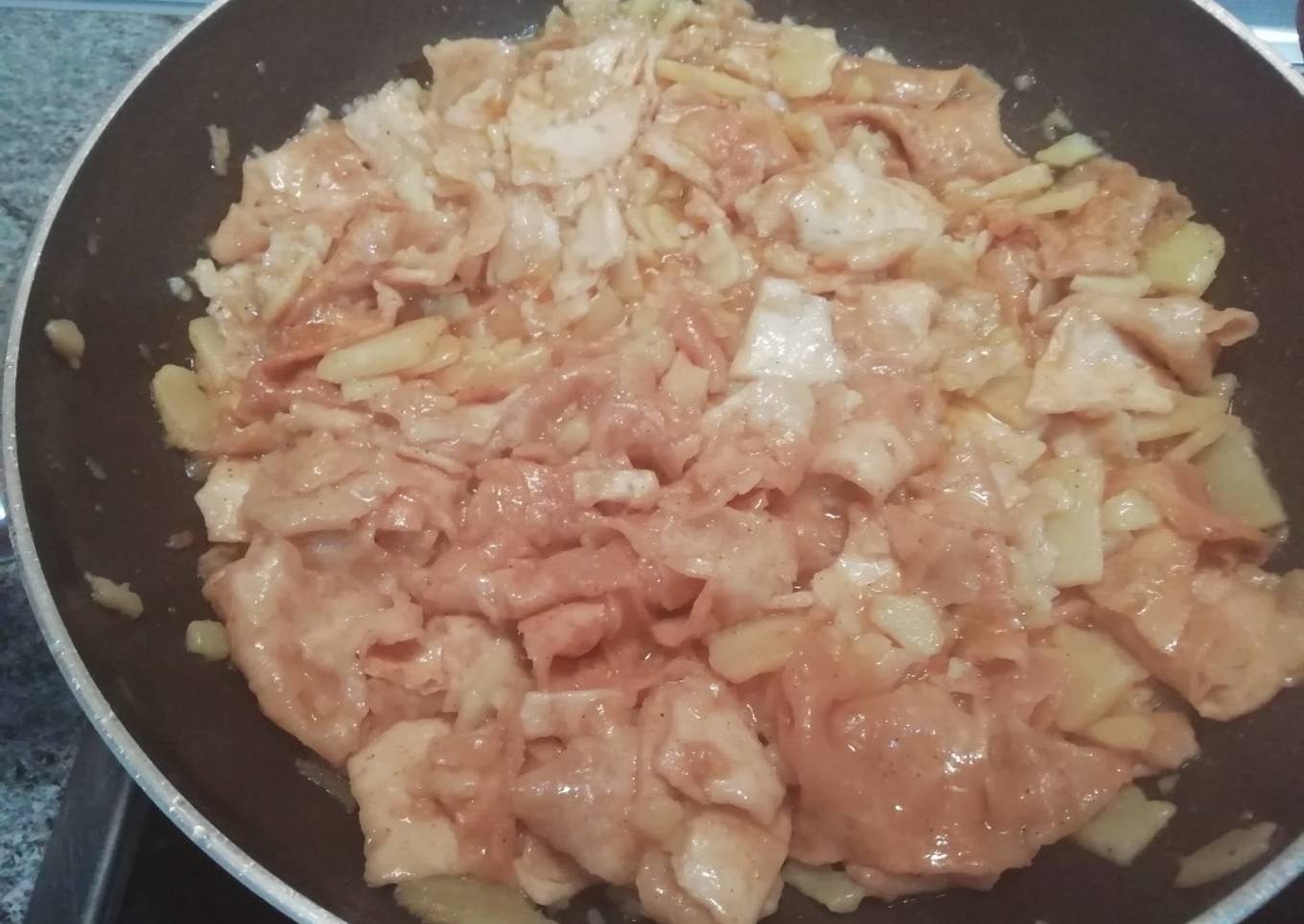 - Con el aceite y grasita de las tajadillas, freímos las patatas con un poco de pimienta