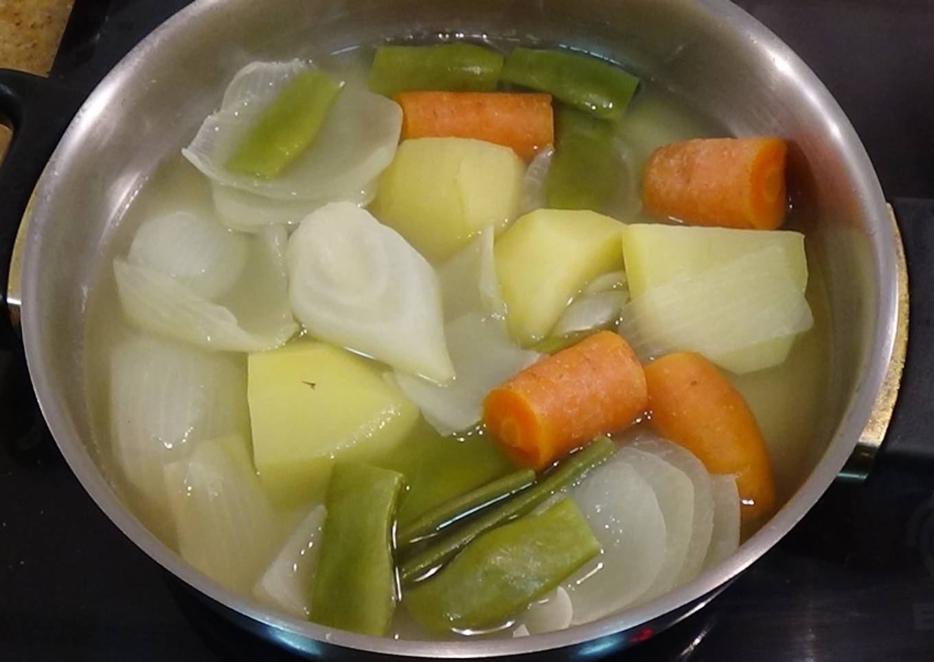 - Calienta el agua, pela la cebolla, corta por la mitad luego en 3. Corta la zanahoria en rodajas de unos 3 centímetros, añade al agua, cocina 10 minutos. Pela la patata, corta en 4, corta las puntas de las judías y corta en bastones de 3 centímetros.