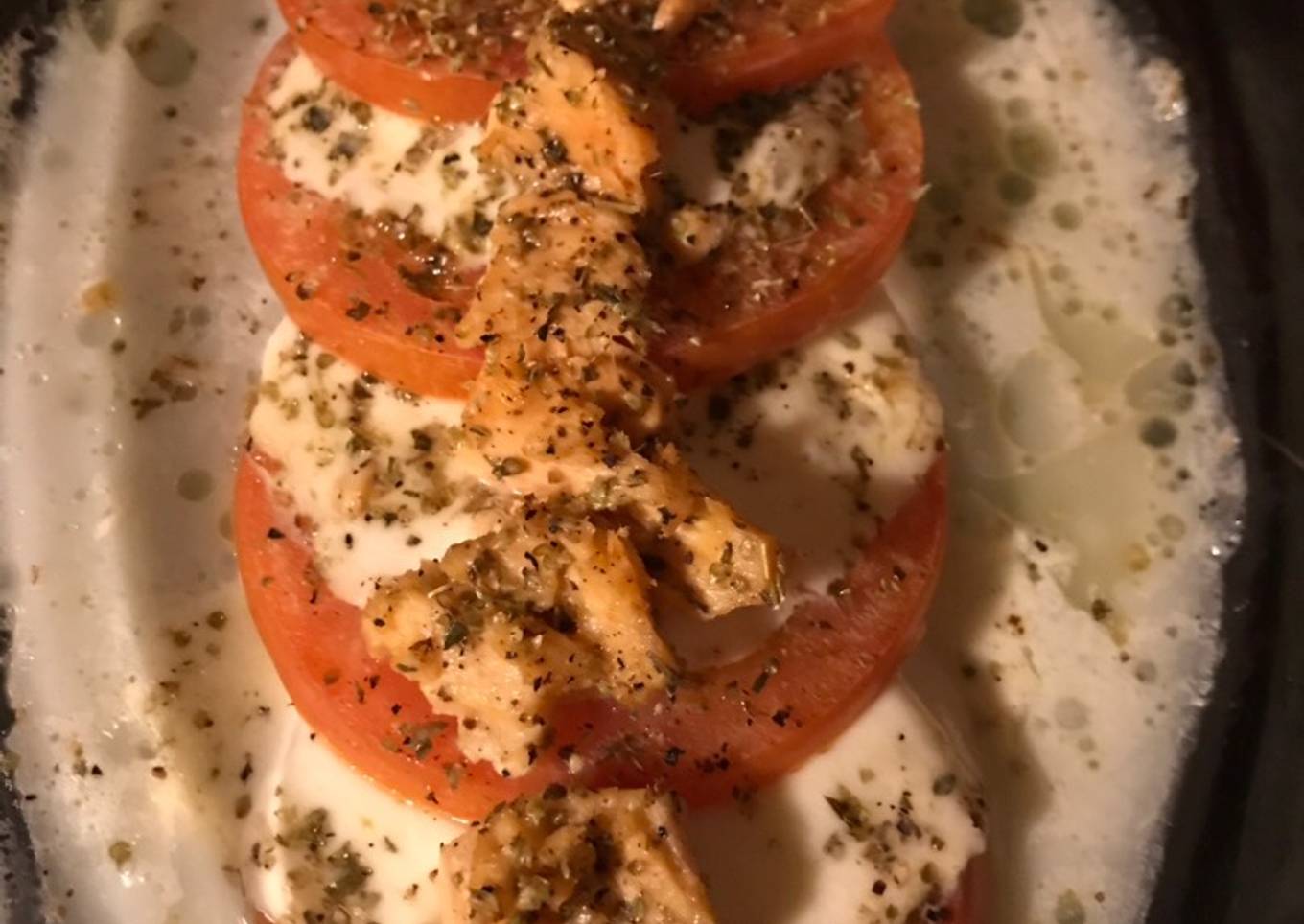 - Los ordenamos :rodaja de tomate y rodaja de mozzarella en una bandeja, por encima ponemos el salmón, salpimentamos y echamos el orégano y el aceite de coco. Precalentamos el horno y horneamos 15 min. aproxima mente y listo para comer !