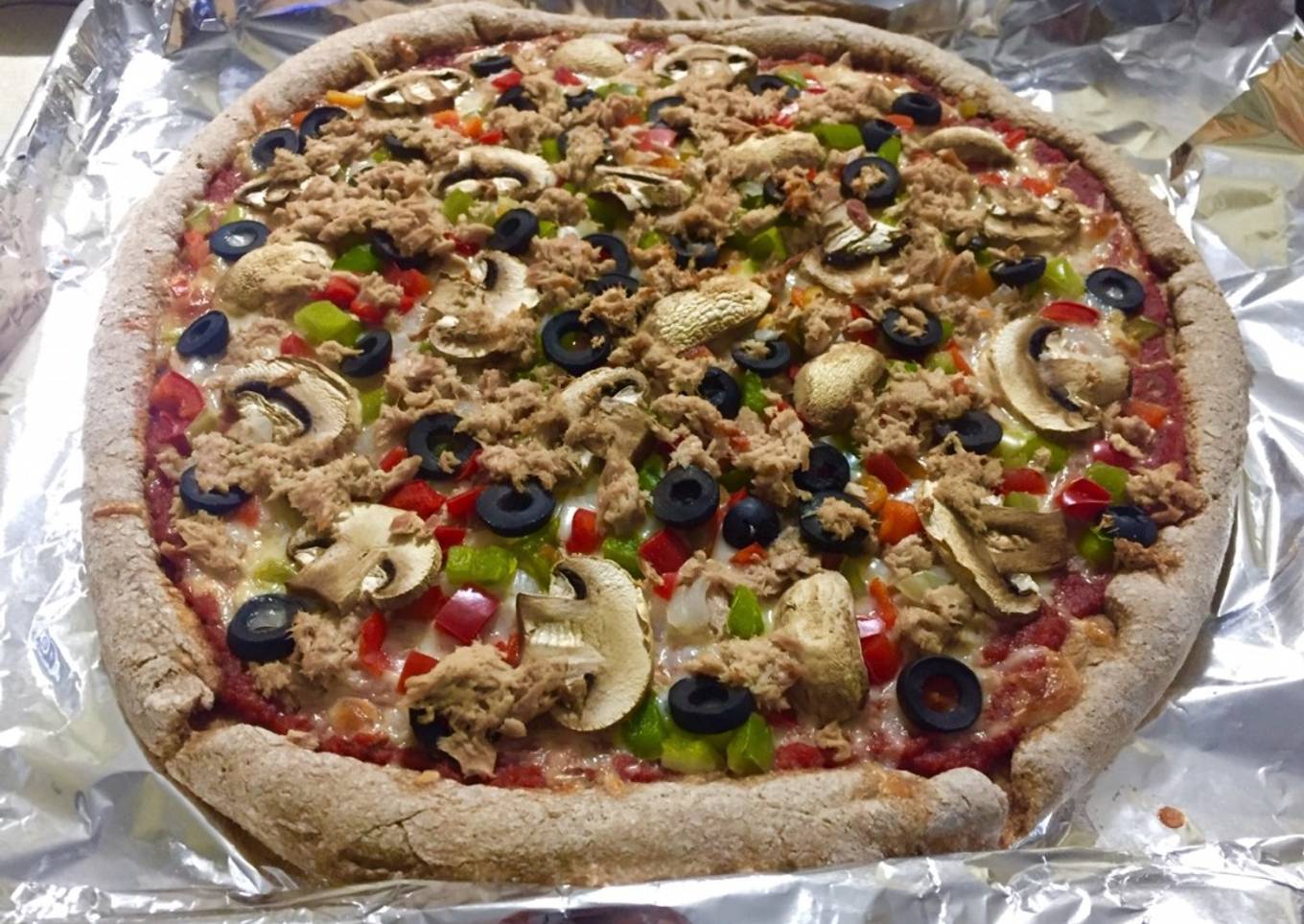 Pizza masa integral casera de atún, pimiento verde y rojo, cebolla, champiñones y olivas negras