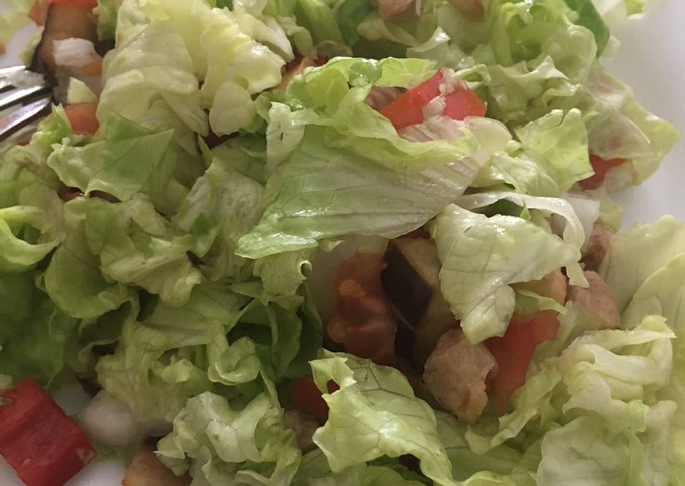 - Justo antes de comer, añadimos lechuga fresca, tomate y lechuga y aliñamos con un pelín de aceite, vinagre y sal