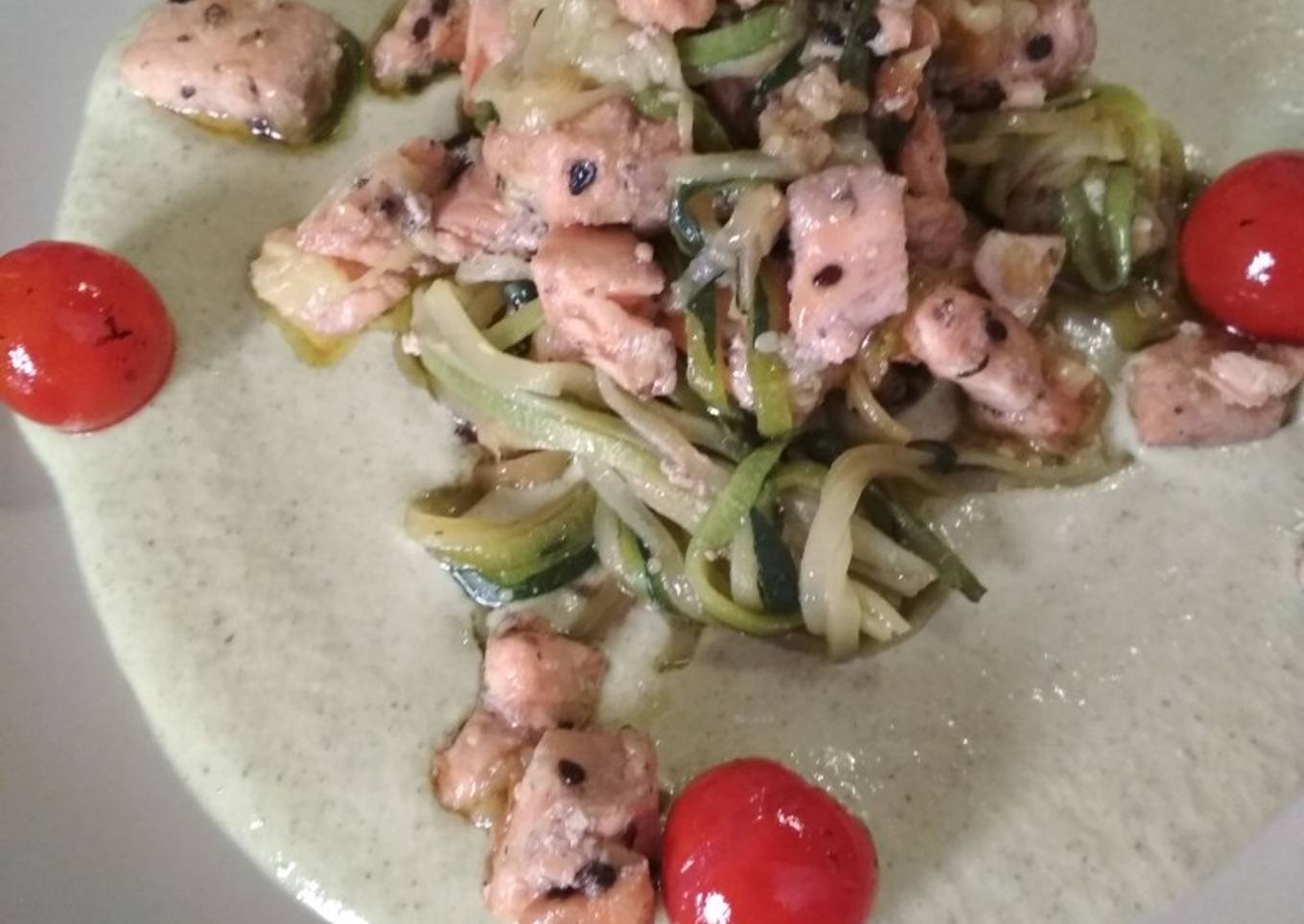 Tallarines de calabacín, salmón y crema de brócoli