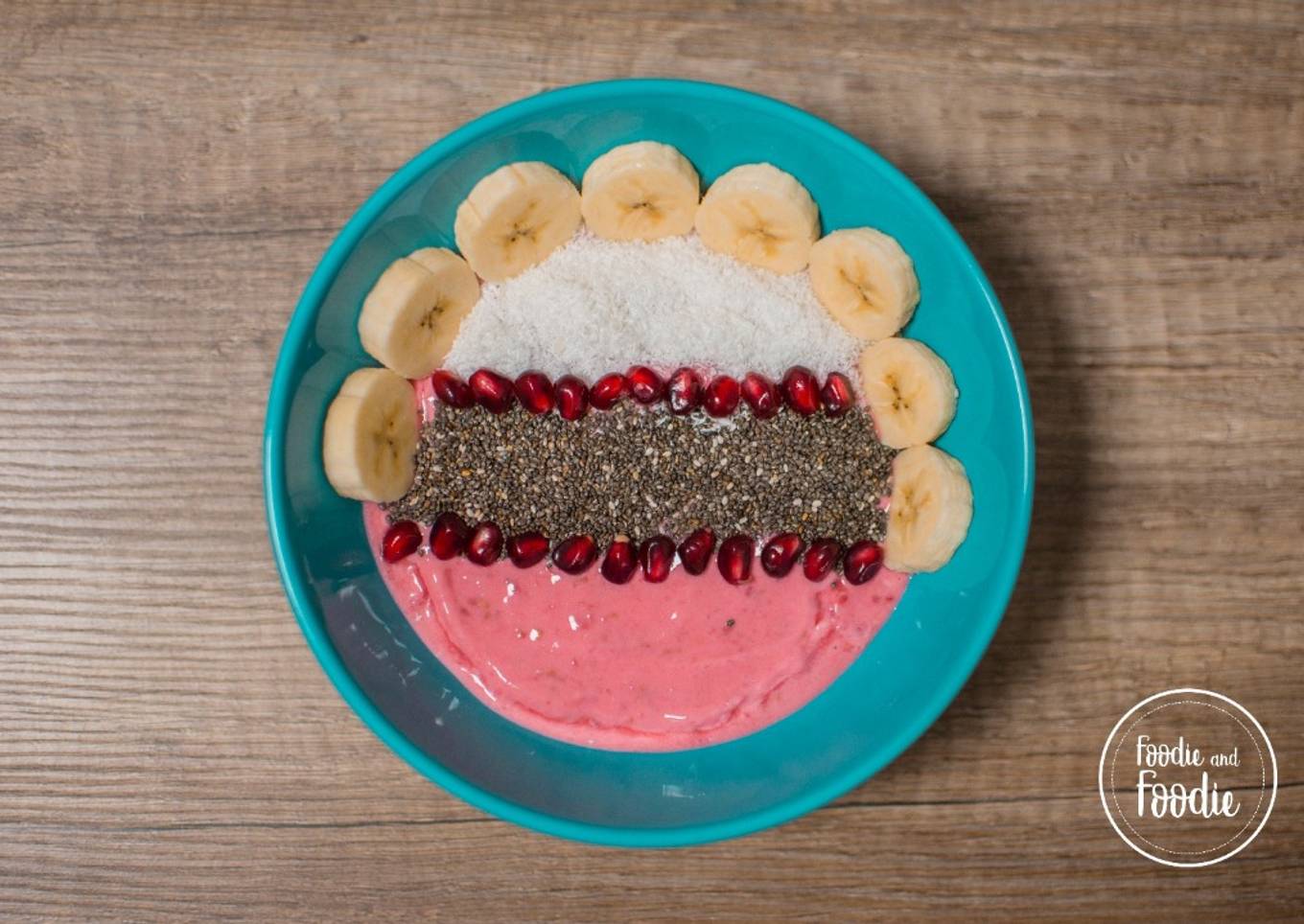 - Ponerlo en un bol y decorarlo con el plátano cortado en láminas, las semillas de granada, la chia y el coco rallado.